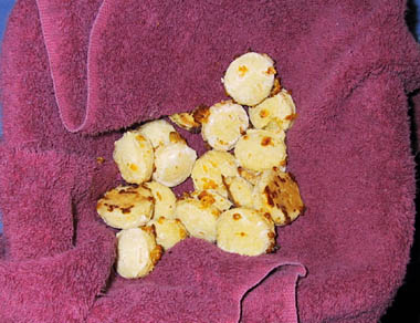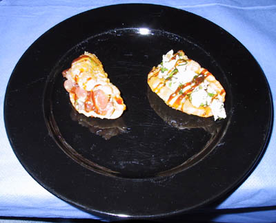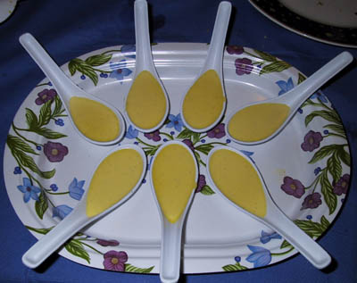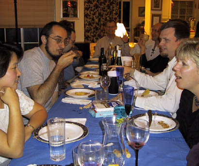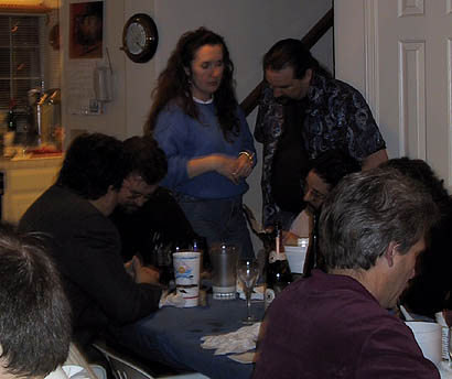 As a Christmas gift, the Weller's put together a multi-course dinner for their gaming friends. Usually the dinner is followed by a D&D game either on the same day or the next. For the 1999 Christmas dinner, Mike put together another one of his fabulous dinners pictured below; please note that not all the colors came out quite right in the pictures. Under most of the meal pictures is the name of the course in bold, the name of the dish, and the beverage that was served in italics. Friends from both the San Francisco bay area and from southern California came for the dinner and the eleven hour game that followed on the next day. A very big thank you goes out to both Mike and Celia (and for Shawn who was very good and cute). The courses: