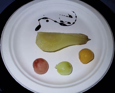 Fruit Late Harvest Poached Pear with Harlequin Melons and Reduced Balsamic Vinegar Pear Eau de Vie |