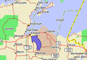 Ashland is located at the foot of Lake Superior's Chequamegon Bay. The Chippewa indians orgininally inhabited this area and the French built a dwelling just off the beach in 1659. It wasn't until 1854 when Asaph Whittlesey and another Ohioan named Geroge Kilborn settled in the area that the current town started to form. The railroad came to town in 1877 and the City of Ashland was incorprated in 1887. A number of historic brownstone buildings still grace the streets, evidence of its history as a center for brownstone quarrying. The site has its own web site also. |